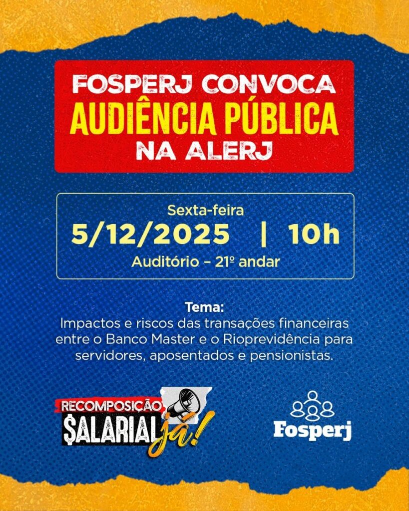 O encontro abordará um tema de altíssimo impacto para o funcionalismo: os riscos e consequências das transações financeiras realizadas entre o Banco Master e o Rioprevidência. As operações em questão envolvem o fundo que garante aposentadorias e pensões de milhares de famílias, podendo influenciar diretamente a segurança, sustentabilidade e equilíbrio das contas previdenciárias do Estado.